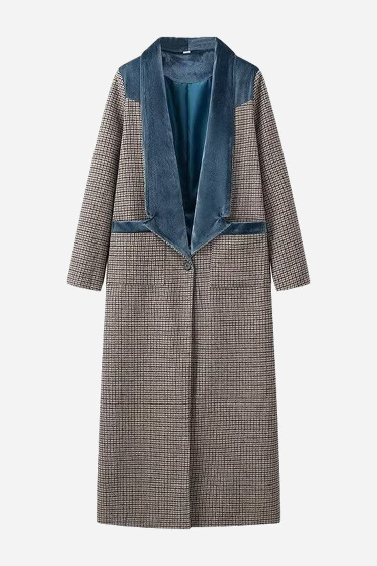 Karierter Wollmantel mit tiefem V-Ausschnitt und Stehkragen